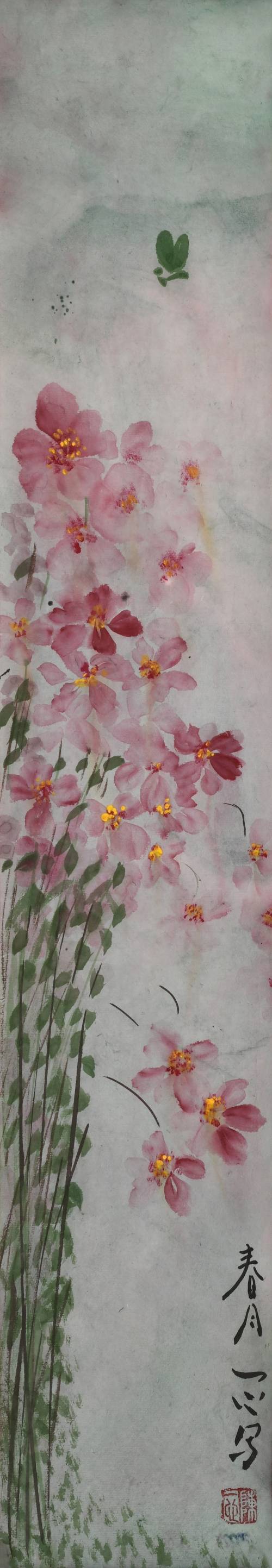 陈一心是一位富有才情的花鸟画家,他喜欢从杂乱无章的自然花草中,选取美的结构,同时又遵循着自然的规律,着力表现出自然造就美。其作品画面雅洁,流利婉转,散发出一种清新悠扬的艺术神韵,既有深厚传统根基,又有新水墨的创意精神,其笔墨技巧非常丰富。在构图、色彩、气韵上已经形成了自己独特的面貌。他笔下桃花、杏花、梅兰竹菊,有的枝干弯弯折折、自然天成,有的花明叶暗,舒展自如……这些都是自然造就的美,只不过被画家随手拈来,将色彩、空间、构成等元素融合于水墨的点线之间,运用自己超强造型能力,成功完成视觉形象的重塑。