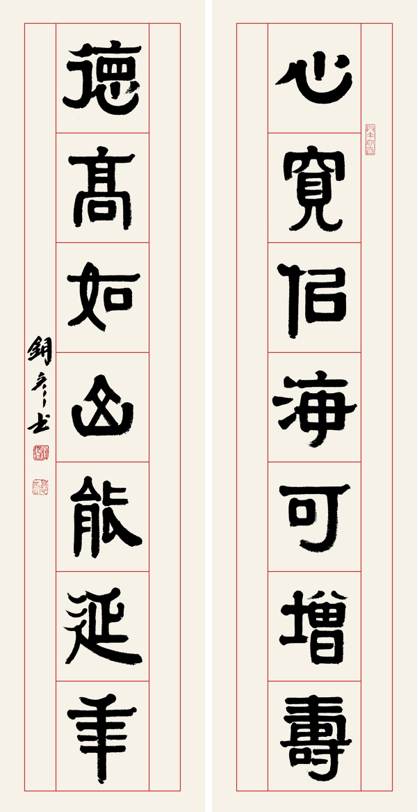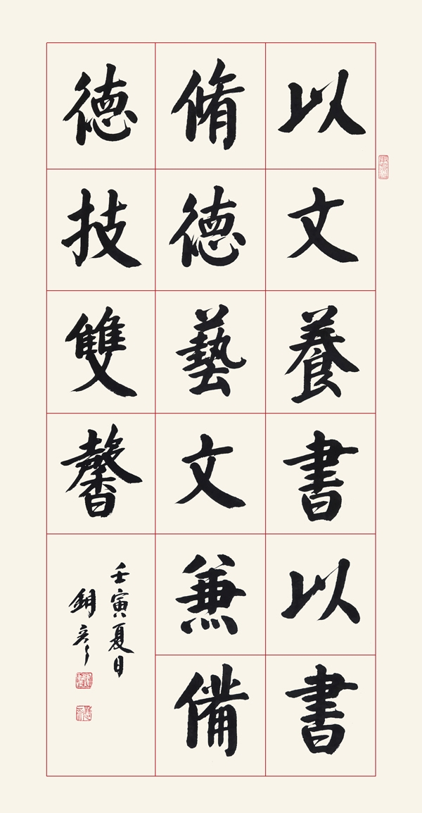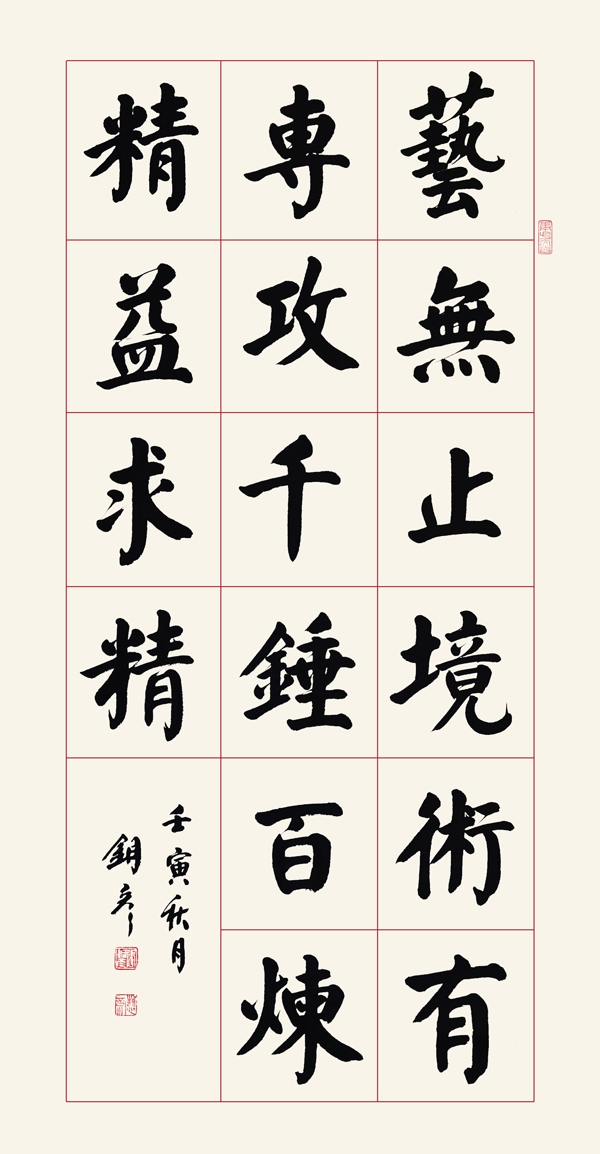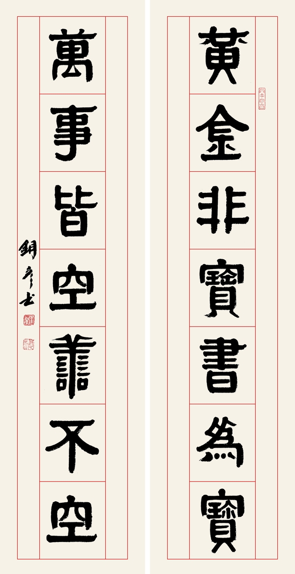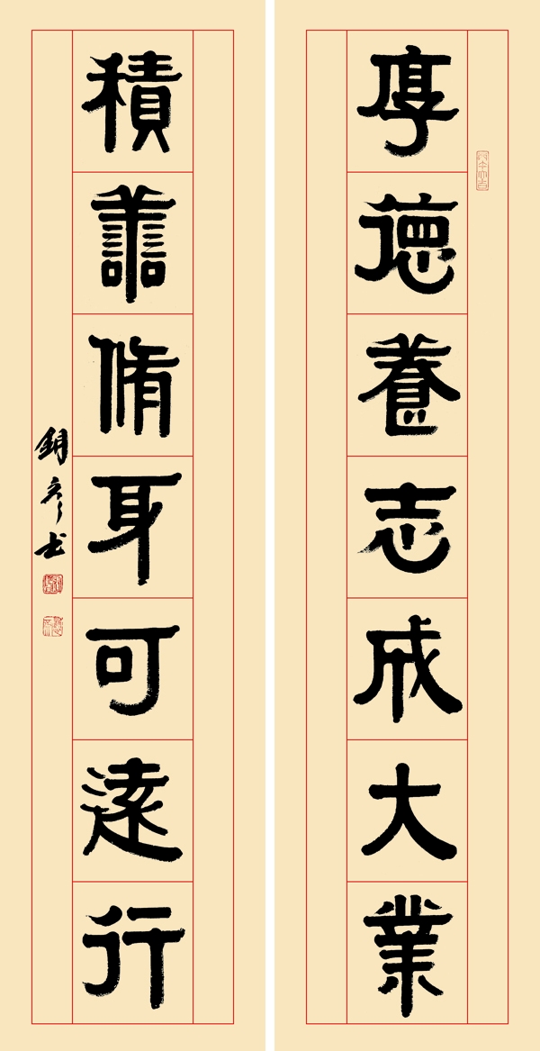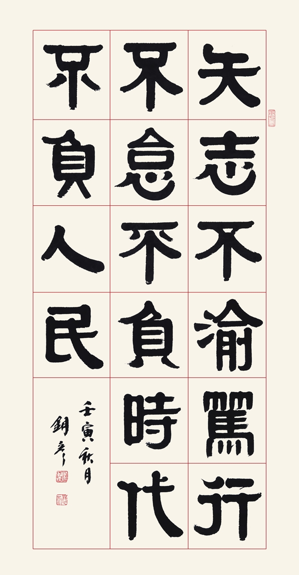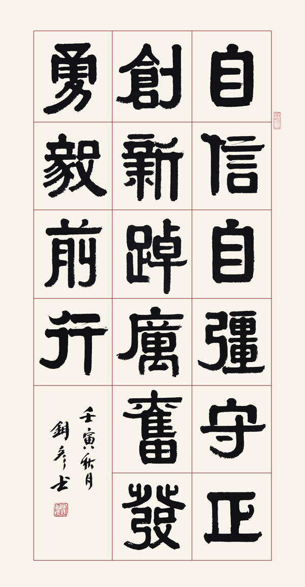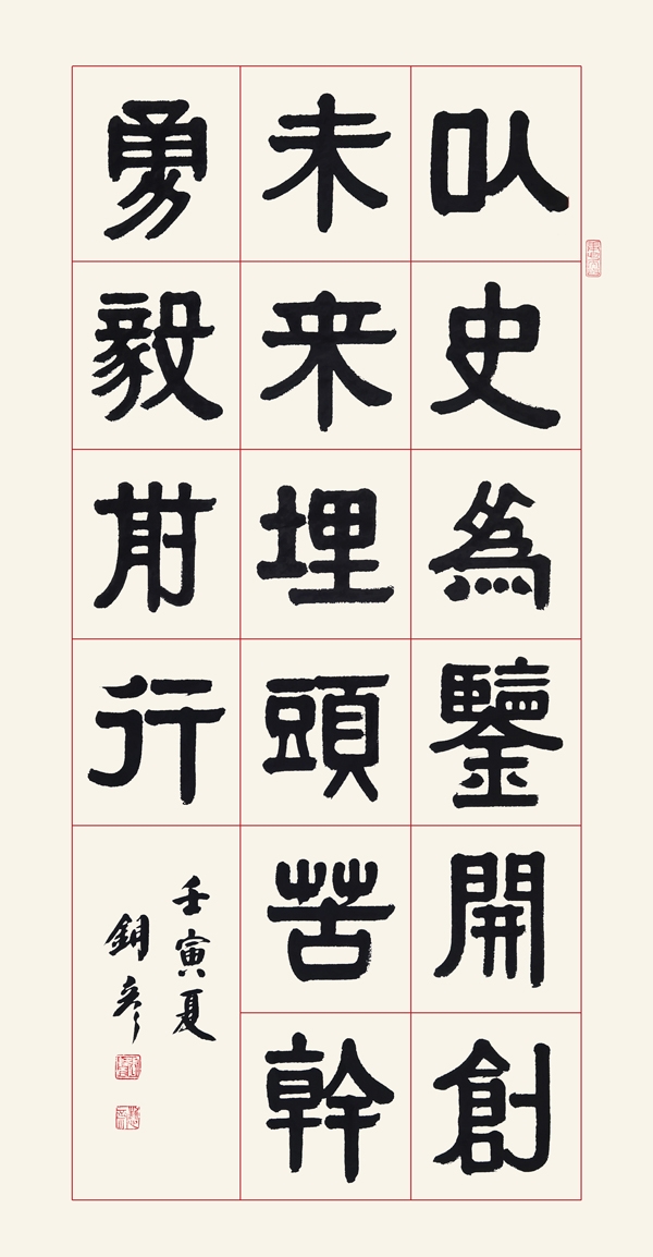 他的隶书直接取法伊秉绶。伊秉绶是从汉代来的,这种汉代精神,这种整齐、浑厚、开张,恰恰适应了张铜彦的内心世界。他的功夫是所有书家中,我认为下得最大的一位。任何一点时间和空间,他都在做书法的事情。做一件创作,先要拿出小样,然后再写大样,然后再创作。他投入的时间和精力比一般书法家都要高若干倍。在这种书体上我认为他是悟通了。伊秉绶的那种大拙见大巧的感觉他是写出来了。现在书法界和社会上都比较认可,他写得这种厚重劲,直接把伊秉绶的感觉写出来了,甚至写得比伊秉绶还厚重。该灵动的地方,比如某些细节也有了,这就叫拙中见巧,都拙也不行,拙中一定要有巧,一个字里面一定找一个地方把灵动表现出来,这就好啦。如果提个建议的话,就是这种红线格使得所有字都在收,都在标准化,这一点要注意。总的说,他的伊秉绶在所有书体中还是最突出的,换句话说,是大家最认可的,再换句话说,社会上影响最大,都是可以的。
