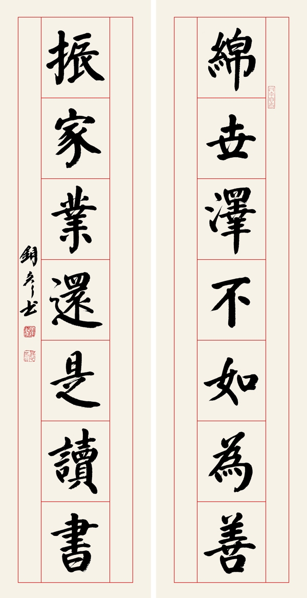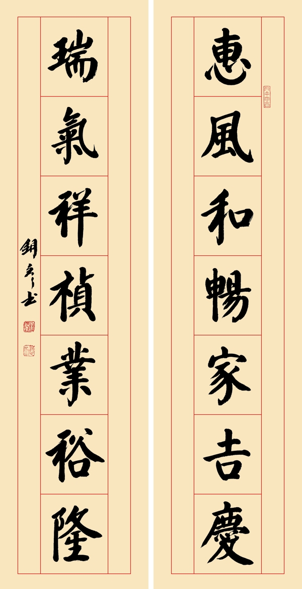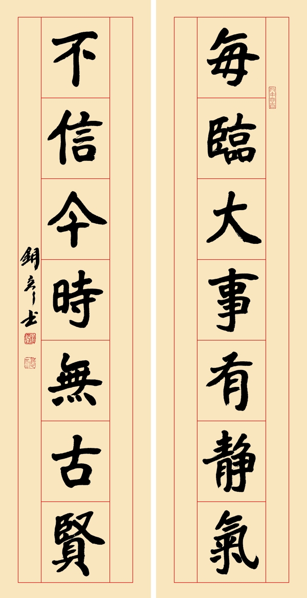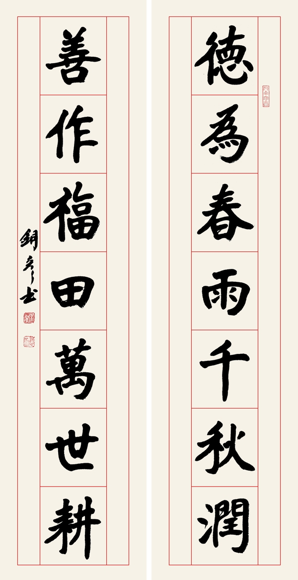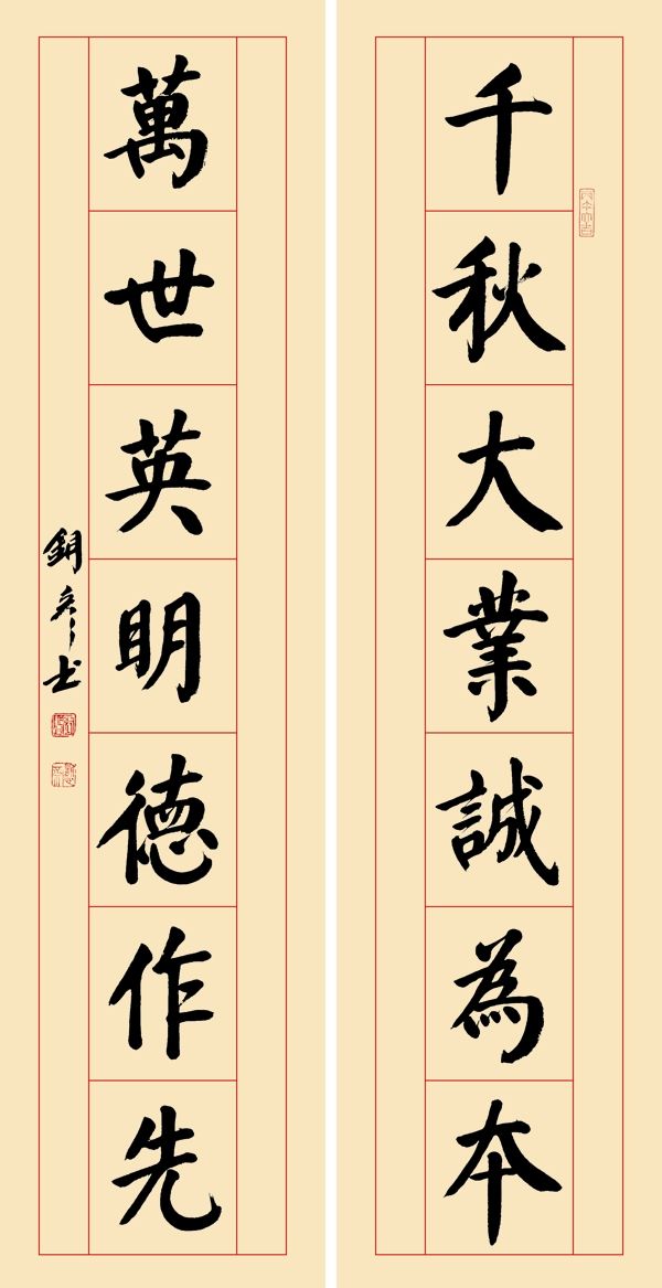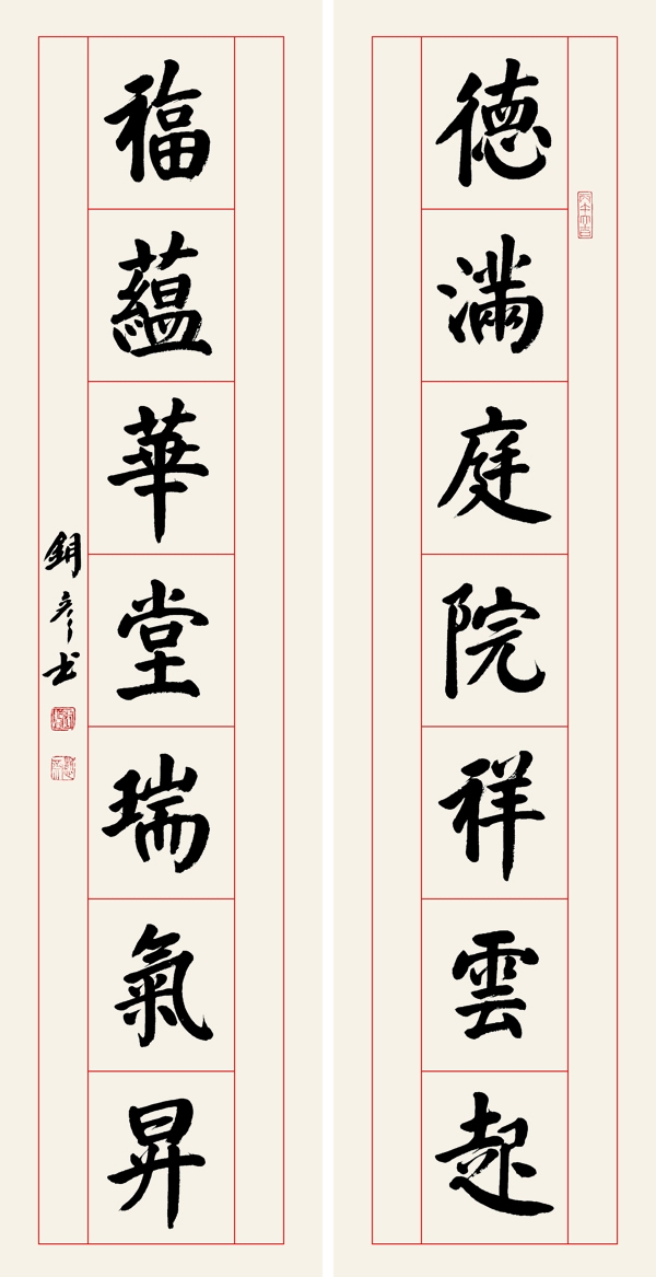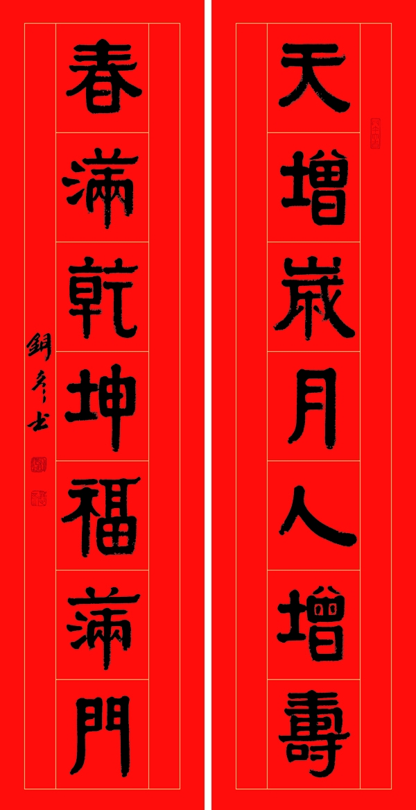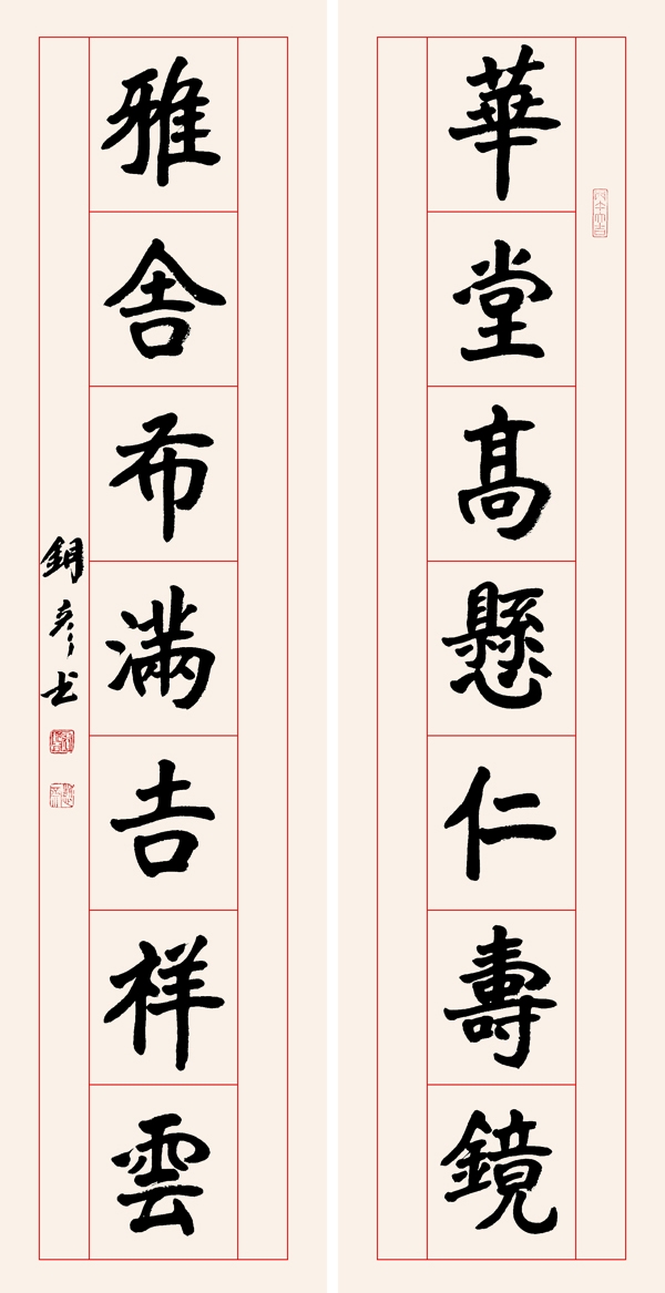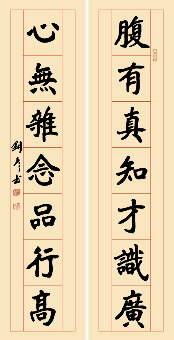 他的隶书直接取法伊秉绶。伊秉绶是从汉代来的,这种汉代精神,这种整齐、浑厚、开张,恰恰适应了张铜彦的内心世界。他的功夫是所有书家中,我认为下得最大的一位。任何一点时间和空间,他都在做书法的事情。做一件创作,先要拿出小样,然后再写大样,然后再创作。他投入的时间和精力比一般书法家都要高若干倍。在这种书体上我认为他是悟通了。伊秉绶的那种大拙见大巧的感觉他是写出来了。现在书法界和社会上都比较认可,他写得这种厚重劲,直接把伊秉绶的感觉写出来了,甚至写得比伊秉绶还厚重。该灵动的地方,比如某些细节也有了,这就叫拙中见巧,都拙也不行,拙中一定要有巧,一个字里面一定找一个地方把灵动表现出来,这就好啦。如果提个建议的话,就是这种红线格使得所有字都在收,都在标准化,这一点要注意。总的说,他的伊秉绶在所有书体中还是最突出的,换句话说,是大家最认可的,再换句话说,社会上影响最大,都是可以的。