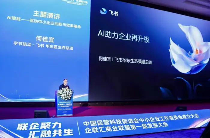 紧接着,字节跳动飞书华东区生态总监何佳宜以《AI赋能——驱动中小企业创新与效率革命》为题进行了主题演讲,分享了AI技术在中小企业创新和效率提升方面的应用与实践。