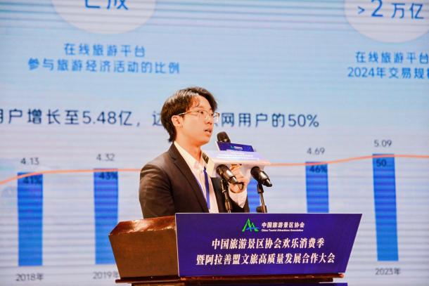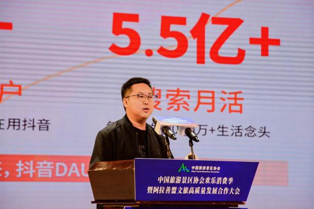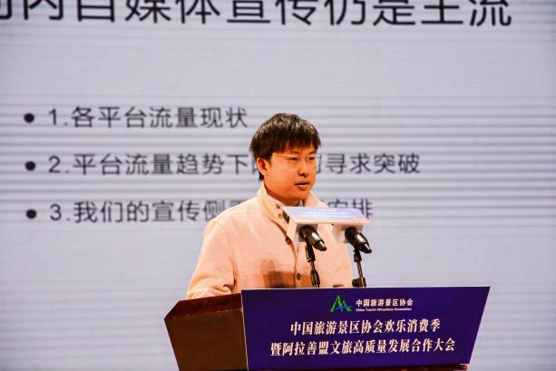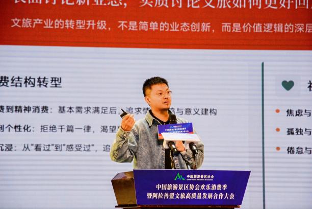 主旨演讲环节,中国旅游景区协会荣誉理事长姚军,中国人民大学创意产业技术研究院副院长、文化品牌评测技术文化和旅游部重点实验室副主任宋洋洋,中国旅游车船协会监事长、中国旅游车船协会自驾游与露营房车分会秘书长刘汉奇,千万级粉丝头部文旅自媒体创作者“长安范儿”姜硕,携程研究院文旅产业及数据中心主任姜文恒及抖音生活服务KA游玩行业内蒙负责人张亚东,分别围绕“十五五”文旅转型升级、体验经济与消费变革、自驾业态培育、OTA流量赋能、文旅内容创作破圈等议题分别演讲,结合阿拉善文旅现状拆解案例,为高质量发展提供切实路径。