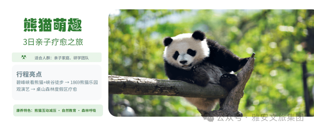 线路一:熊猫萌趣·3日亲子疗愈之旅——碧峰峡+1869中国大熊猫生态世界+桌山森林康养度假区,适合亲子家庭、研学团队。