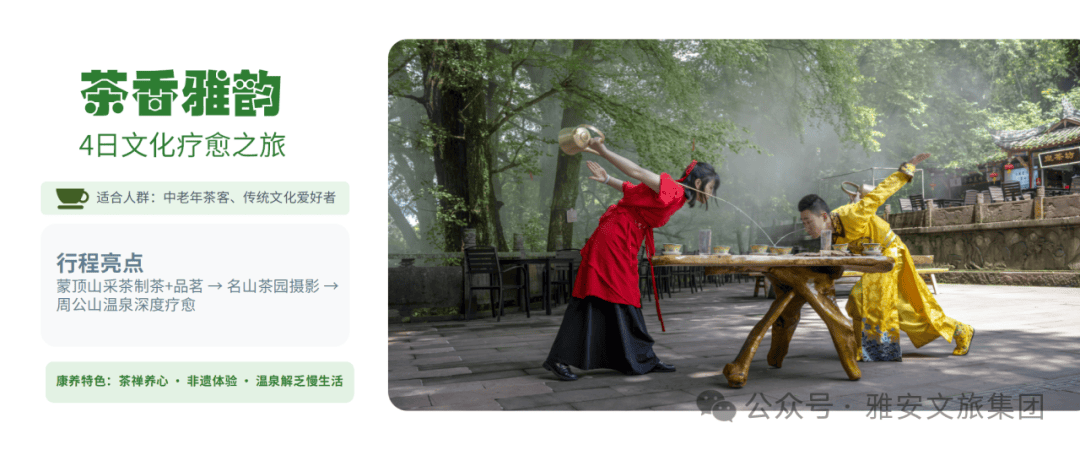线路二:茶香雅韵·4日文化疗愈之旅——蒙顶山+名山茶园+周公山温泉,适合中老年茶客、文化爱好者。