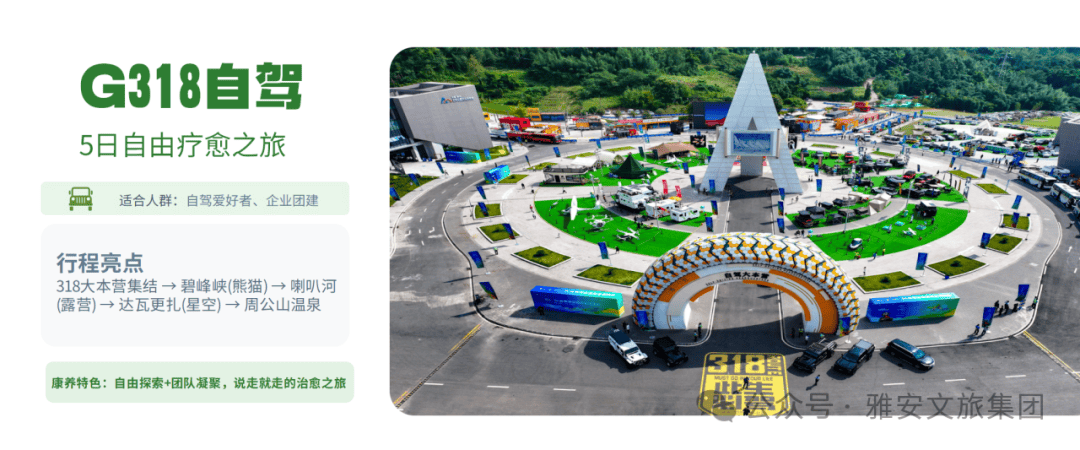 线路四:G318自驾·5日自由疗愈之旅——318自驾大本营+碧峰峡+喇叭河+达瓦更扎+周公山温泉,适合自驾爱好者、企业团建。