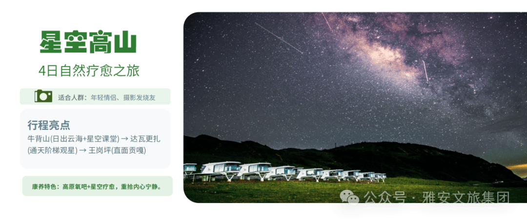 线路三:星空高山·4日自然疗愈之旅——牛背山+达瓦更扎+王岗坪,适合年轻情侣、摄影发烧友。