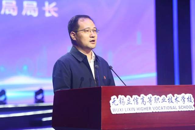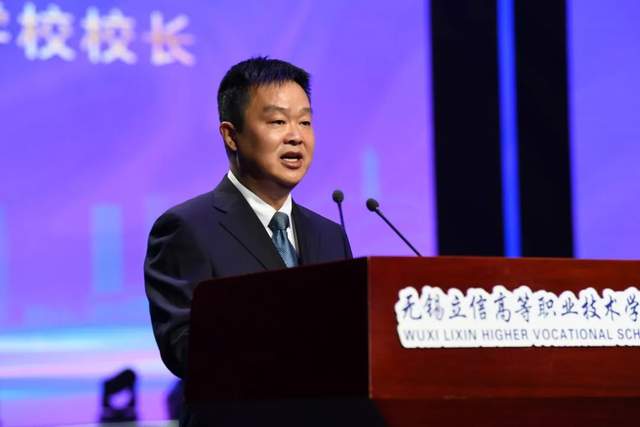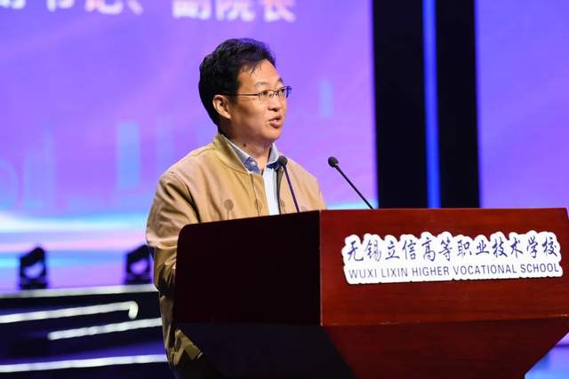 无锡市教育局局长宋新春讲话。他表示立信高职作为无锡职业教育的重要一员,始终牢记以开拓者的姿态推进改革发展,打造成为无锡职教的一张靓丽名片。