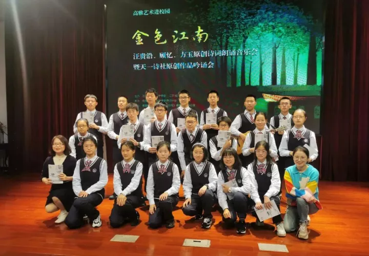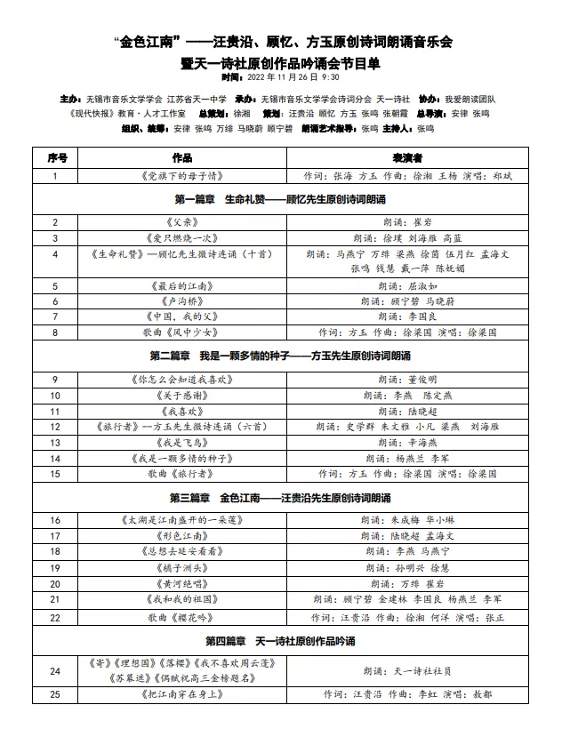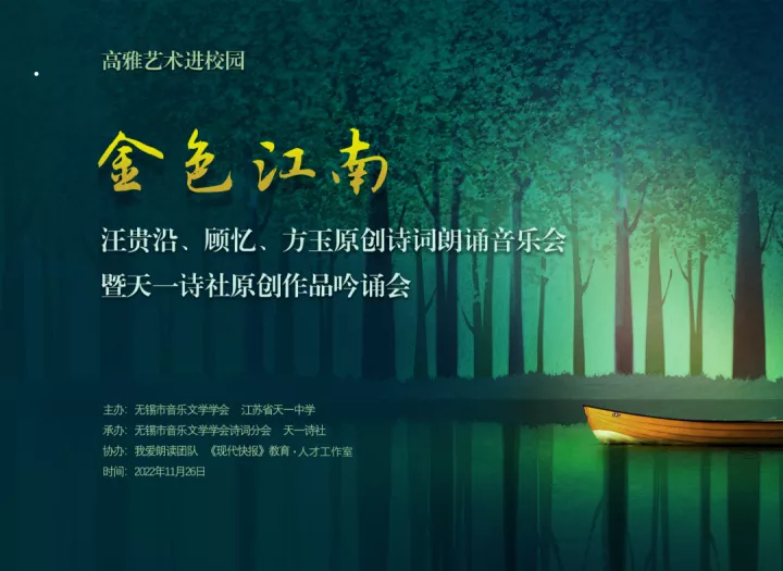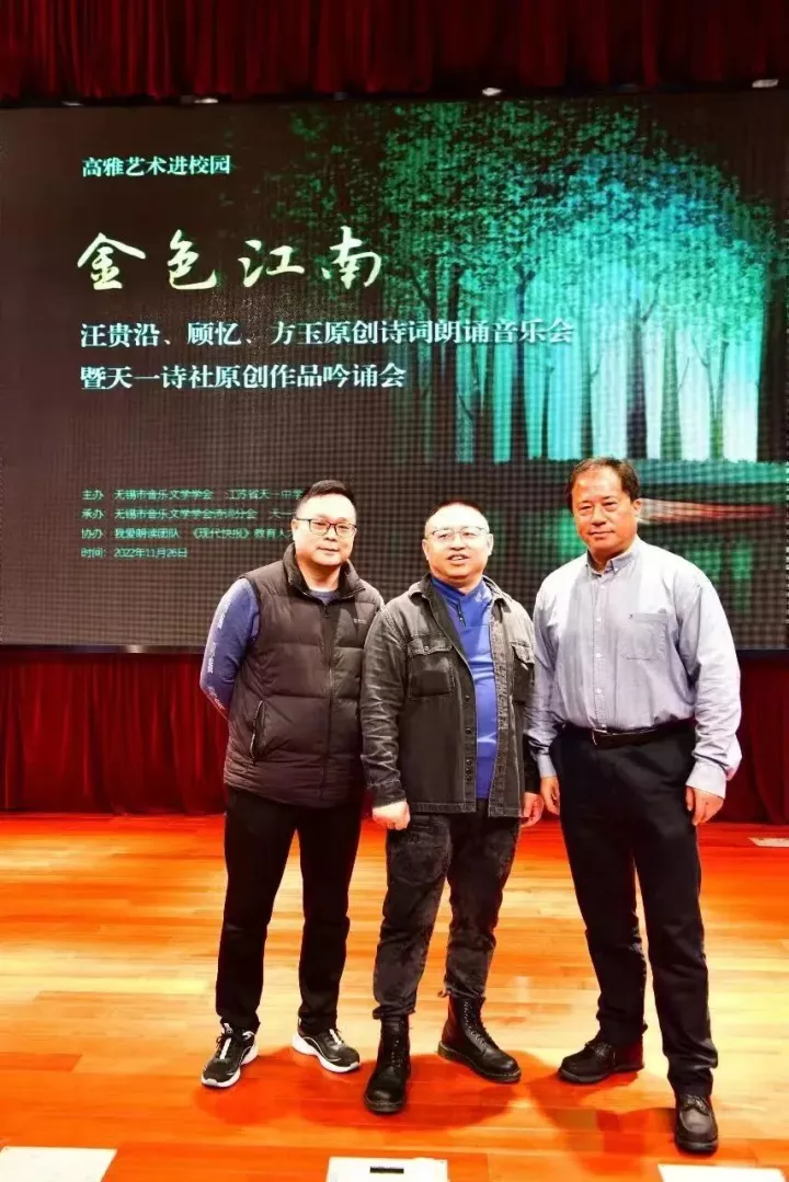 2022年11月26日上午,由无锡市音乐文学学会、江苏省天一中学共同主办的“金色江南——汪贵沿、顾忆、方玉原创诗词朗诵会暨天一诗社原创作品吟诵会”在江苏省天一中学举行。