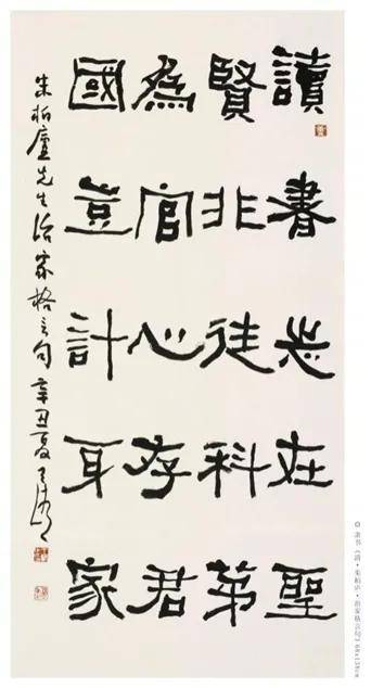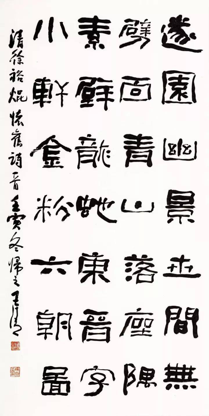 隶书《朱柏庐治家格言句》。四尺中堂,因尺寸不大,正文字数仅20个,字径14公分,在展厅中并不显眼。但细察颇有可赏处。该作用笔流畅、爽利、简约、肯定,技法娴熟、稳定。起笔均取逆势,方圆、藏露、钝利、轻重、抑扬于不经意间,自然生发,形态各异。走笔多含提按波动,但幅度较小。王清以前的隶书作品,由于刻意追求碑刻的剥蚀效果,为了表现金石趣味,提按和波动比较强烈,往往失度。而此作明显调整,运用细腻、丰富、精准的用笔,加上手腕和手臂的力量,同时辅之以笔杆的方向转换,八面出锋,故线条清朗挺劲、质直峭拔。畅达而不失雄健,奔纵而不脱准绳。端庄杂流丽,刚劲含婀娜。其长横画多作上扬弯状,由何绍基出。然雁尾不作重顿,有石门颂笔意。相向竖画均取内擫状,森然紧结。点和短画,轻松随意,活泼生动,可谓“一画之间,变起伏于峰杪,一点之内殊衄挫于毫芒”,即合此意。此作结构,方正端庄,宽博雄阔,雍容有度,落落大方,不强作变化,故作姿态,深得东汉摩崖石刻三昧,有正大气象,可称近期隶书力作。当代隶书创作,相较于其它诸体,不容乐观。近来大展,评委多叹佳作难得。不是模古就是拟今,作品风格大多不出刘文华、张继、张建会、崔胜辉、杜鹏飞诸家。而王清隶书却不受当代人影响,不受时风左右,坚守自己的审美理想,从古人的优秀作品中去寻找适合自身要求的艺术元素,以期出古入新,取精用宏,博采约取,自成一家面目。有同道评王清隶书作品像清朝人写的,说明王清对于清人隶书在技法、形式、风格、精神、韵味的把握上已非常全面和到位。能写到古人深处这已属不易,但作为生活在当代的书法家,尚需有更高的追求,包括个人风格语言的进一步提炼和强化,时代审美气息的展现。而王清正在朝这个方向努力,技法既熟,茹古又深,假以时日,必有欣喜。
