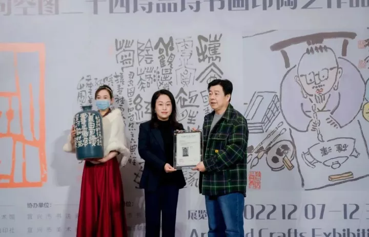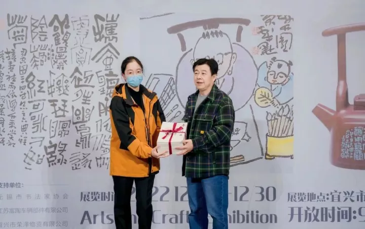 查元康向宜兴市美术馆捐赠紫砂古风大陶瓶一件,由宜兴市文体广电和旅游局副局长徐英姿上台接受捐赠并颁发美术馆收藏证书