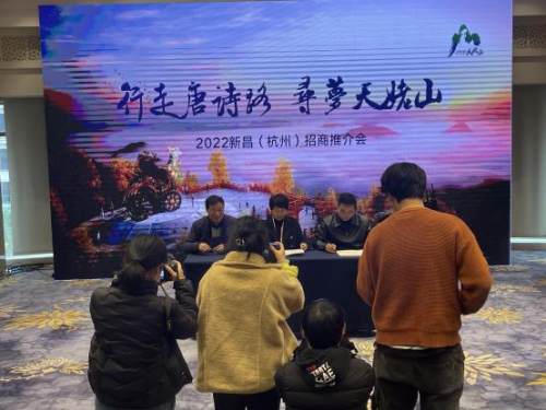 “行走唐诗路.寻梦天姥山”,新昌县天姥山文化旅游发展中心, 2022 新昌 (杭州) 招商推介会,于 12 月 7 日在西子湖畔隆重举行, 杭州多家知名旅行社与浙商代表岀席。多家主流媒体也应邀参加这 次盛会,并见证现场的签约仪式,切身感受新昌与杭州共建共享、 融合发展的深远意义。