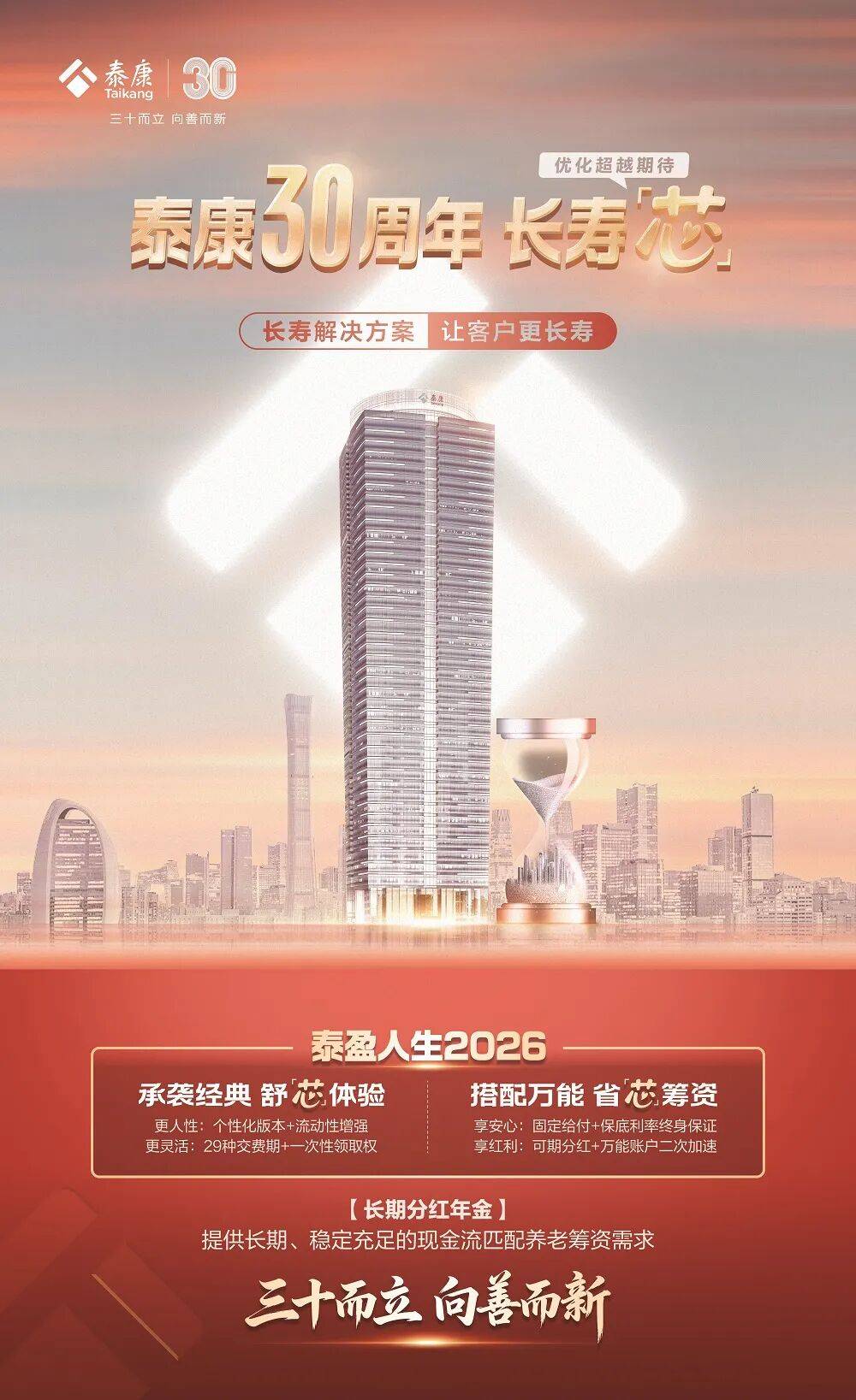 三十而立,向善而新。泰康人寿推出泰康泰盈人生2026(A款)年金保险(分红型)(简称泰盈人生2026),通过“政策税优+保险确定性+长期养老储备”的叠加,为客户打造更适配长寿时代养老需求的筹资方案。