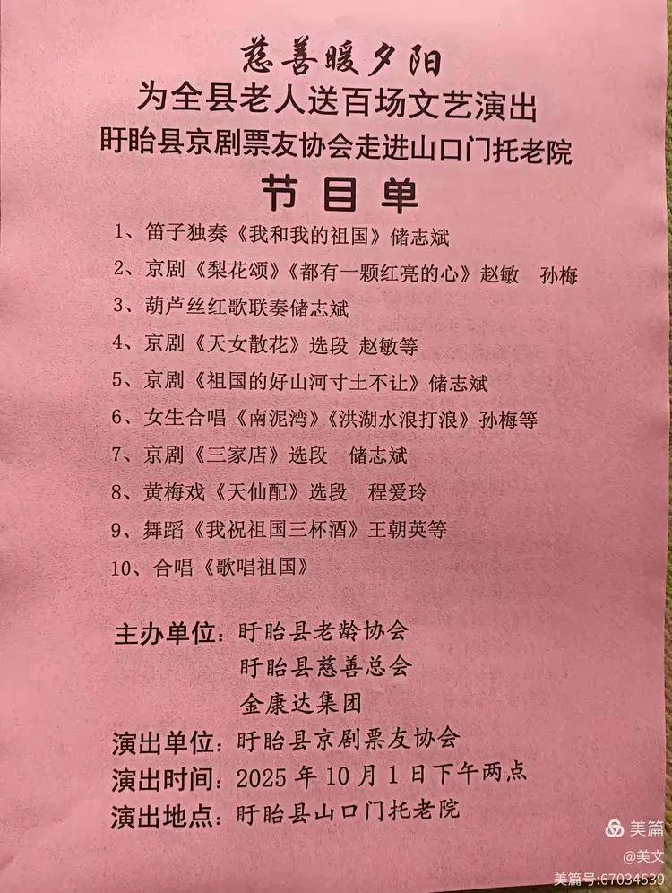 金秋送爽、丹桂飘香,国庆中秋双节期间,盱眙县京剧票友协会持续推进"慈善暖夕阳"演出活动,先后于10月1日国庆节当天下午赴盱城山口门托老院和10月6日中秋节下午赴淮河镇明祖陵敬老院喜迎双节尊老敬老爱老孝老慰问演出。用精彩节目与暖心关怀,陪老人们度过团圆祥和的节日。