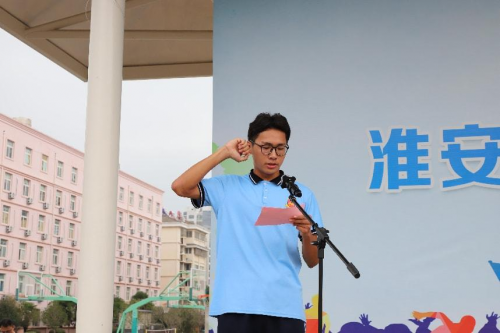 学校田径队队长梅奥同学、淮安市优秀裁判员陈志鹏老师分别代表运动员和裁判员宣誓。