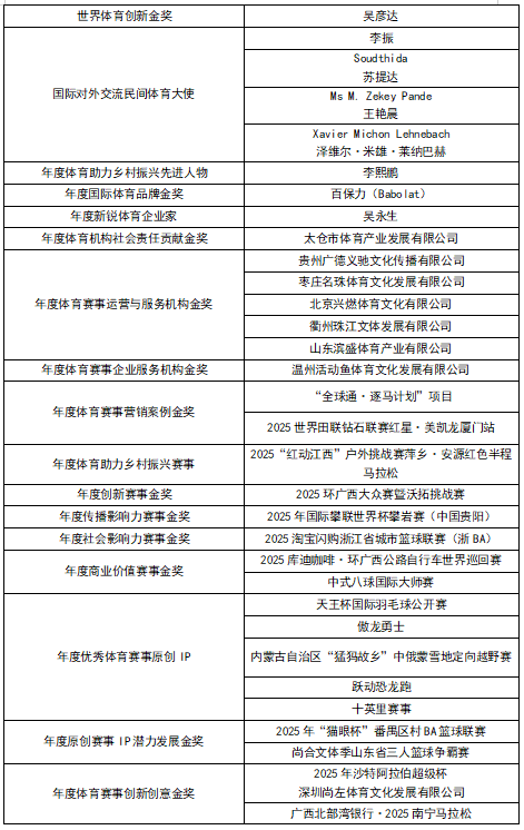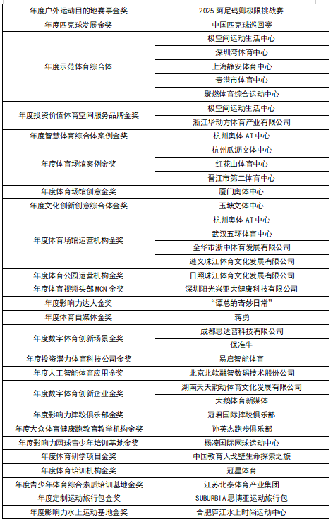 第十一届SPORTIN体育产业大会暨2025体银荣耀盛典的获奖榜单如下。