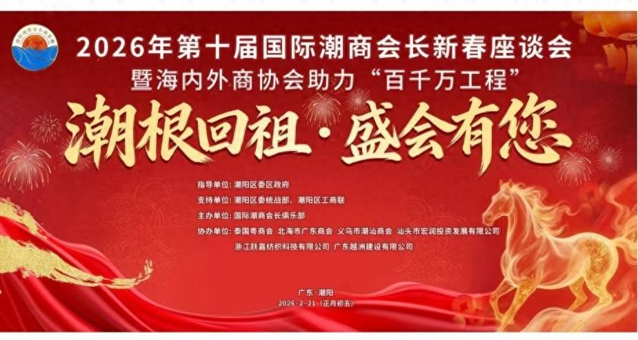 本次座谈会由国际潮商会长俱乐部主办,潮阳区委、区政府指导,潮阳区委统战部、潮阳区工商联支持,是新春伊始潮商群体凝聚共识、链接资源、赋能家乡的重要平台。作为海内外潮商联络乡情、对接商机、传承文化的年度盛会,本届座谈会立足潮阳故土,面向全球潮人,旨在弘扬潮侨文化、传播华人潮商精神,推动潮商力量与地方发展深度融合,助力区域产业升级与文化繁荣。