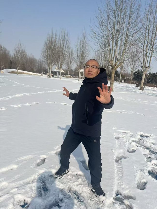 吾观薛兄练拳,心生敬仰。其于雪地,如傲雪之梅,凌寒独放;似坚毅之松,迎风挺立。以一人之身,展太极之魅;于一方之地,传文化之芳。