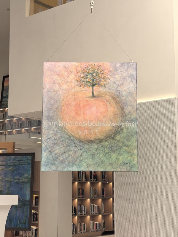 为参与这场名为“悟象”的公益艺术展,左晋专程来杭州待了15天,一口气创作了三幅作品:致敬良渚文明的《三生万悟》、探讨视觉与心灵之爱的《视力表》,以及承载本次慈善内核的《福果》。“我用三天时间画《福果》,但灵感酝酿了很久。”左晋说。画面中央,一颗苹果嵌入心形结构,枝干向上伸展成树,粉与绿交织的笔触温柔又坚韧。“苹果在戈壁滩上不只是水果,它是生命的象征,是牛顿的启示,更是浙江与新疆两地互助的信物。”